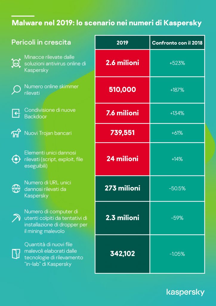 La crescita dei file unici che hanno come scopo lo skimming digitale (script e HTML) rilevati dalle soluzioni antivirus online di Kaspersky è stata pari a +187%, arrivando a toccare quota 510.000 unità. Nello stesso tempo, il numero di minacce rilevate dagli antivirus online è quintuplicato (523%), toccando quota 2.660.000 nel 2019. Gli skimmer online sono entrati a far parte della classifica generale dei 20 oggetti dannosi maggiormente rilevati, posizionandosi al 10° posto. Anche la quota relativa ai nuovi file, di tipo Backdoor e Trojan bancari, tra tutte le tipologie di minacce rilevate in laboratorio, è cresciuta rispettivamente del 134% (arrivando a 7.644.402) e del 61% (arrivando a 739.551).