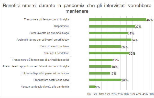 La ricerca ha anche evidenziato che quasi un terzo (31%) dei dipendenti considera il lavoro a distanza come uno dei maggiori benefici emersi durante la convivenza con il coronavirus, subito dopo il tempo trascorso in famiglia (46%) e il risparmio economico ottenuto (37%). Infatti, la maggior parte dei vantaggi è legata al fatto che si possano cogliere nuove opportunità di arricchimento personale al di fuori del lavoro, poiché ottenere un equilibrio tra lavoro e vita privata è diventato ancora più importante.