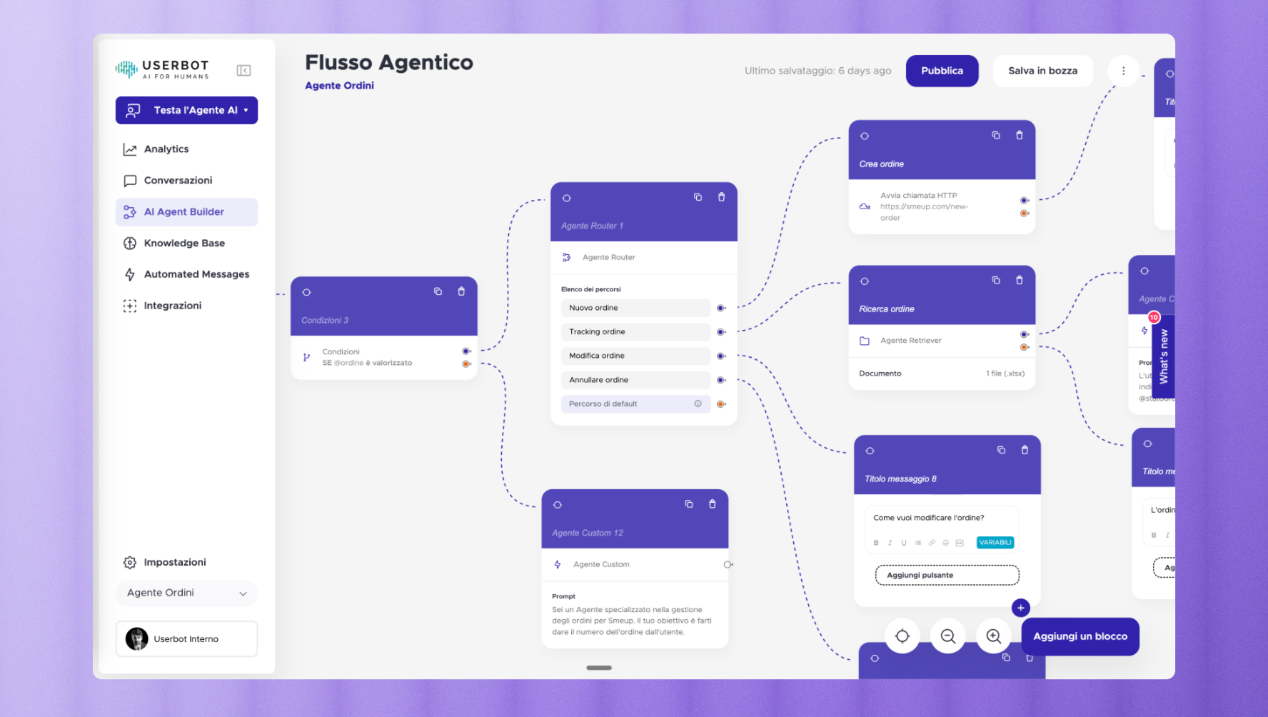 - Personalità e ruolo: per ogni singolo agente viene definito tono di voce, livello di creatività, priorità e limiti d’azione.
