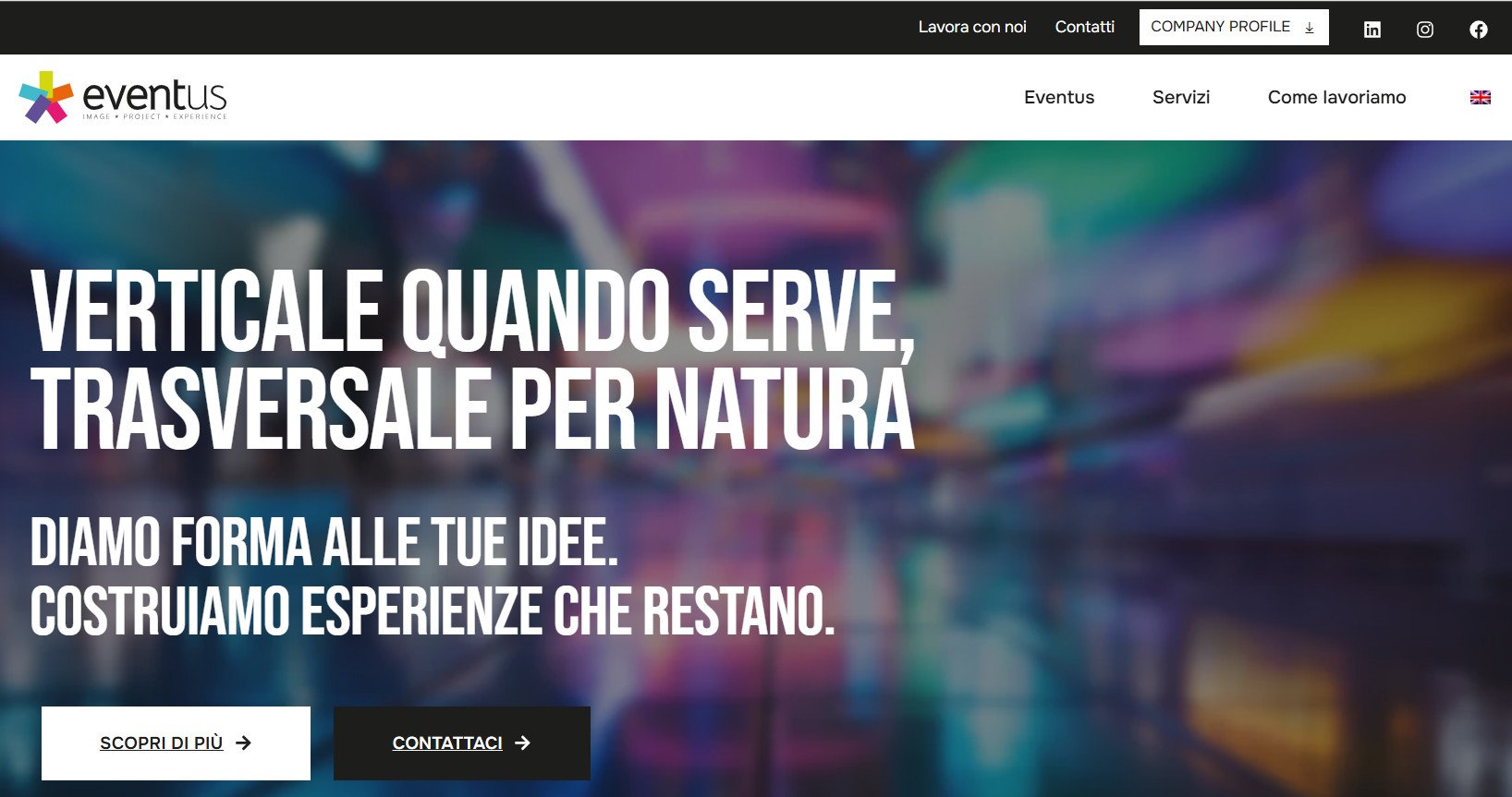 In linea con il payoff “Verticale quando serve, trasversale per natura”, il sito racconta la capacità di Eventus di adottare competenze specialistiche quando necessario, per adattarsi meglio alle esigenze dei clienti, e allo stesso tempo quella di integrare professionalità diverse all’interno di un unico progetto. Il percorso di navigazione guida gli utenti alla scoperta del metodo Eventus, articolato nelle tre fasi Image, Project, Experience che guidano la progettazione degli eventi.