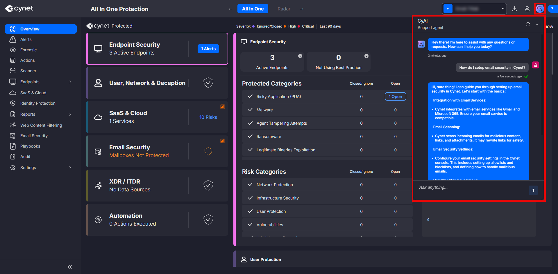 - CyAI Support Agent: un nuovo chatbot AI integrato nella piattaforma Cynet consente agli utenti di porre domande usando un linguaggio naturale su qualsiasi alert e di ricevere immediatamente indicazioni strutturate di remediation. Le risposte si basano sulla cronologia delle indagini CyOps e diventano più accurate man mano che il modello apprende da nuova attività reale.